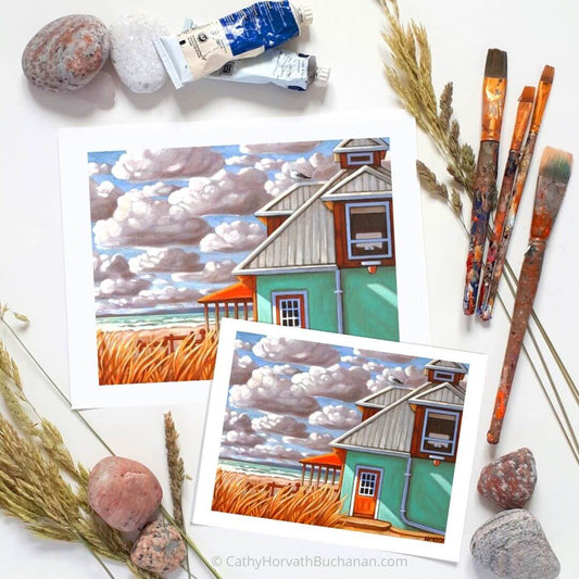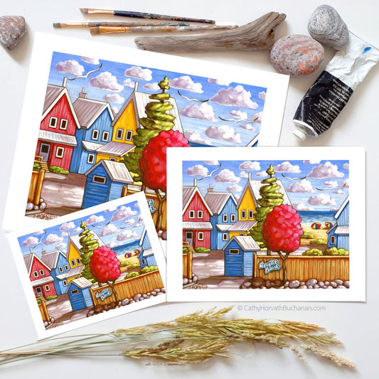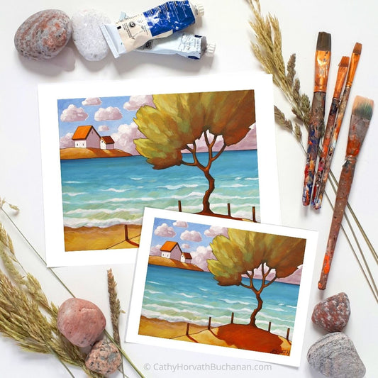 Beach Tree Cottages Seaside Summer Art Print, Coastal Giclee