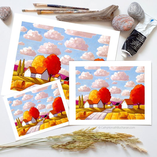 Country Landscape Hay Rolls Folk Art Print, Big Sky Clouds Farmhouse Giclee