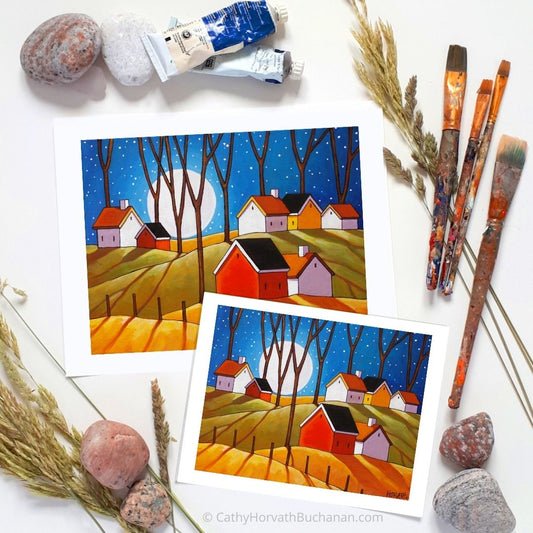 Moon Glow Cottages Autumn Night Art Print, Cozy Fall Landscape Giclee