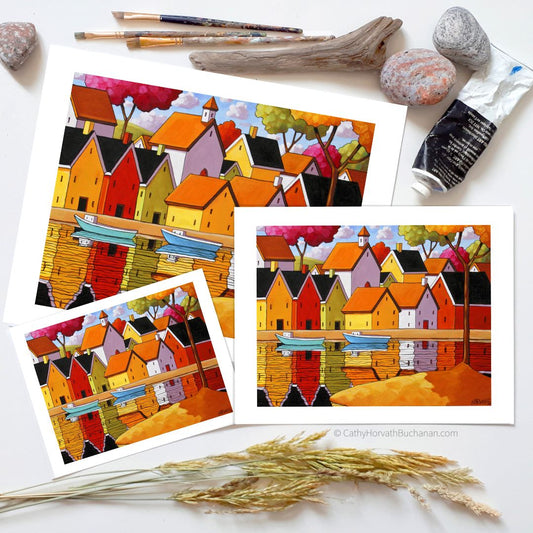 Town Harbor Reflection Art Print, Waterside Village & Boats Landscape