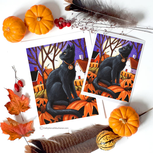Cat Moon Pumpkins Halloween Art Print Seasonal Giclee