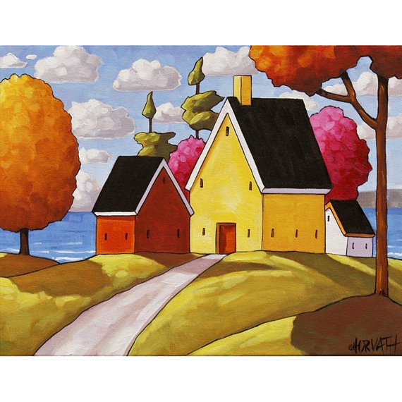 High quality archival Art Print 8x11 Modern Folk Art summer multicolored cottages overlooking a seascape view.