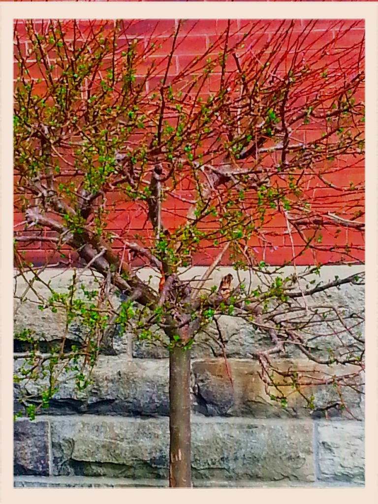 I snapped this photo of this tree in the garden of a nearby church. I loved the organic form of the tree against the structured lines of the building and the difference in textures between the brick vs the stone of the foundation.