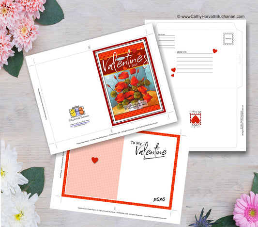 Valentine Flowers Printable Card Kit, w insert paper + envelope, PDF Instant Download