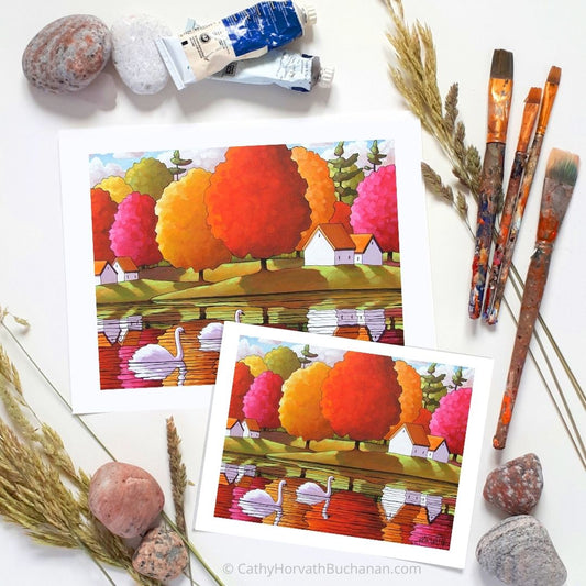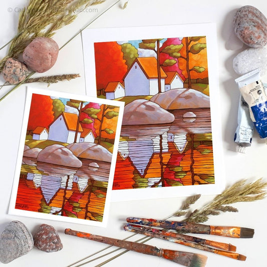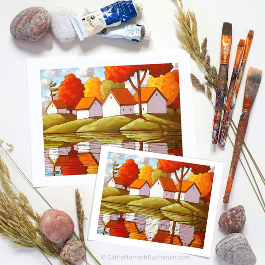Autumn Rocky Shore Art Print, Fall Tree Waterside Cottages Folk Art Giclee