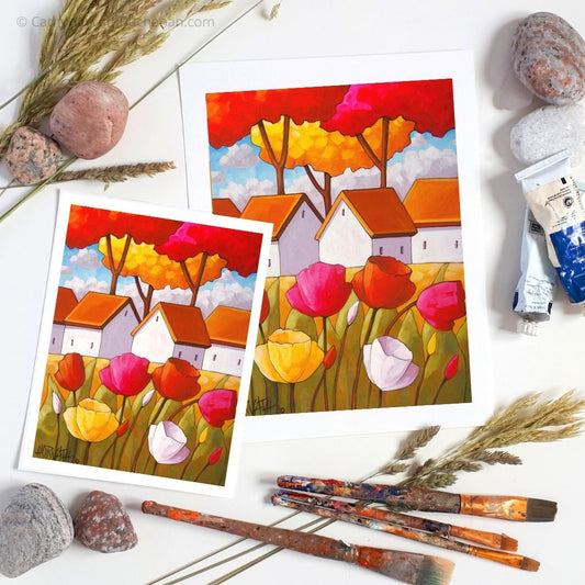 Spring Tulips Flower Garden Cottages, Floral Easter Folk Art Print