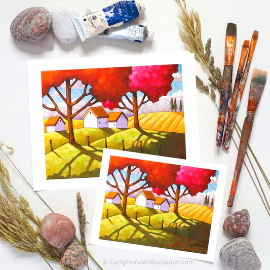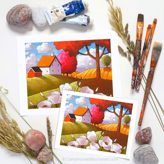 Country Rolling Fields Farm House, Folk Art Print, Rural Fall Giclee