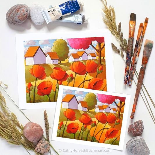 Red Poppy Landscape Art Print Home Decor, Modern Folk Art Flower Garden