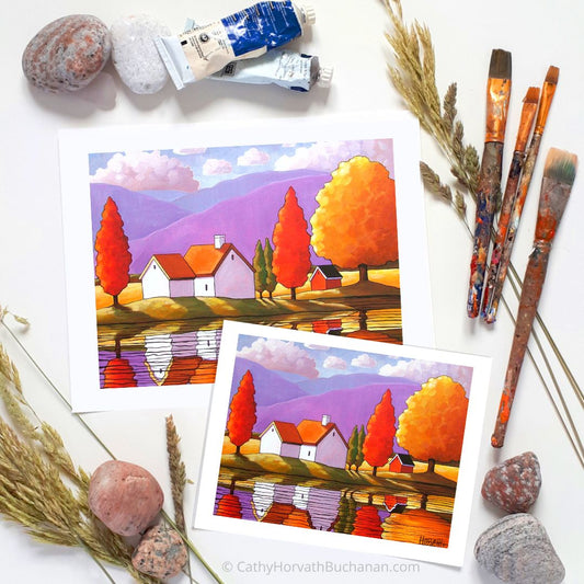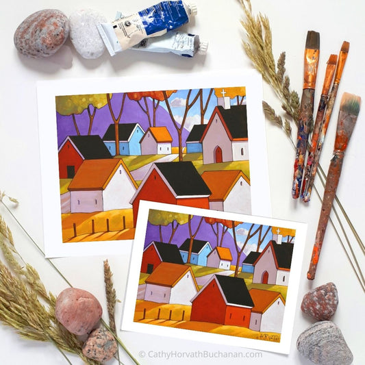 Purple Mountain Tree Colors Folk Art Print, Autumn Cottages Giclee