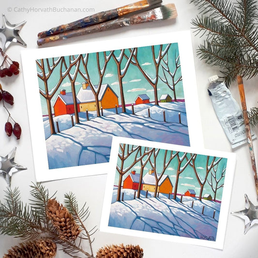 Winter Snow Tree Shadows, Seasonal Folk Art Print, Holiday Decor