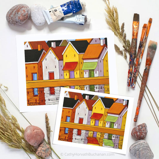 Coastal Island Cottages Folk Art Print, Summer Seascape Decor