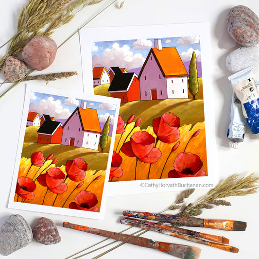 Countryside Poppies Scenery Art Print Home Decor, Wall Art Giclee