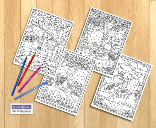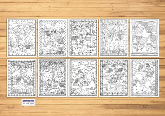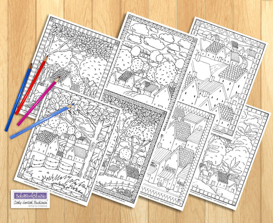 Folk Art Town Village Landscape Coloring Pages 4 Pack, PDF Download Printable