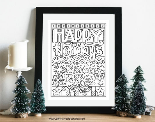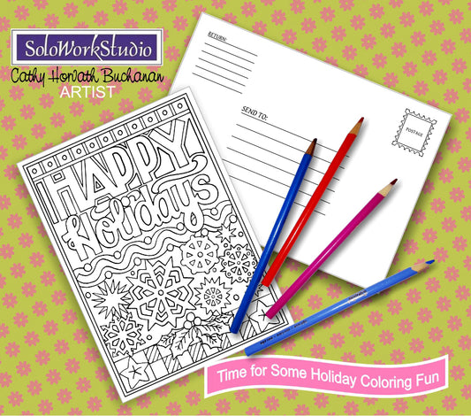 Christmas Holiday Coloring Cards 4 Set Kit + Envelope, PDF Download