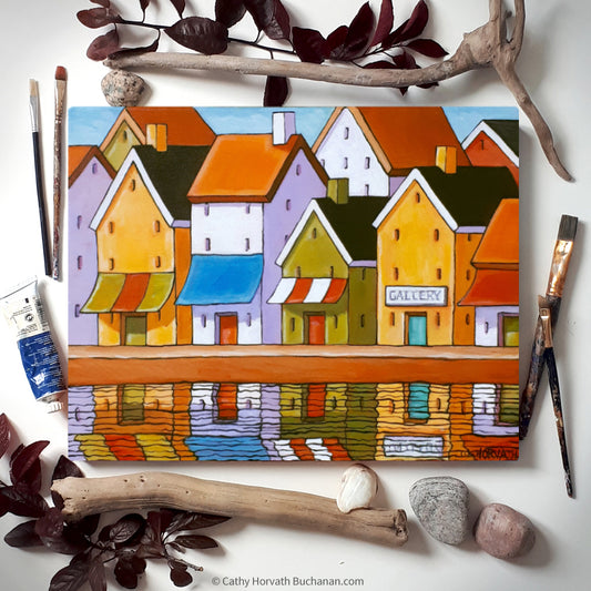 Town Harbor Reflection Art Print, Waterside Village & Boats Landscape