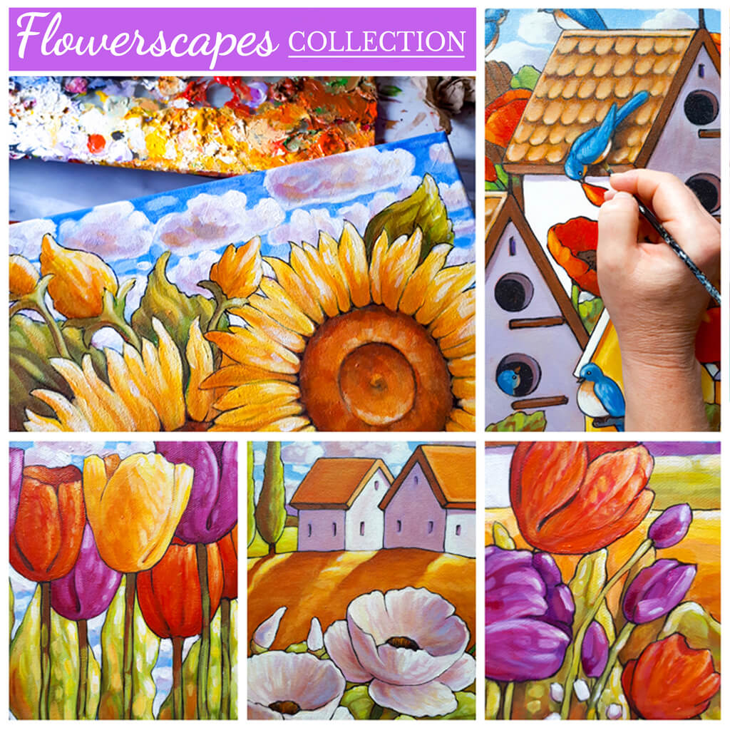 I created this collection of paintings to celebrate how much I love the bright colors and joy that flowers bring into our lives by simply existing. I hope my imaginings of these 'Flowerscapes' will give you as much happiness and joy in your home and life as I had in creating them.