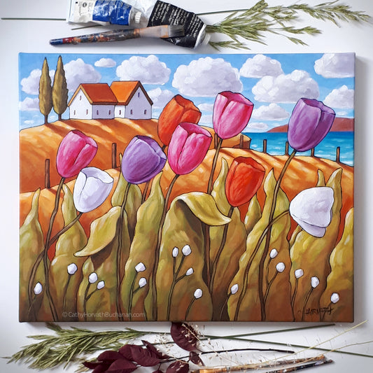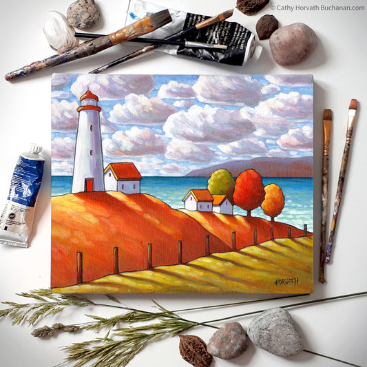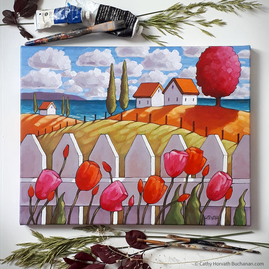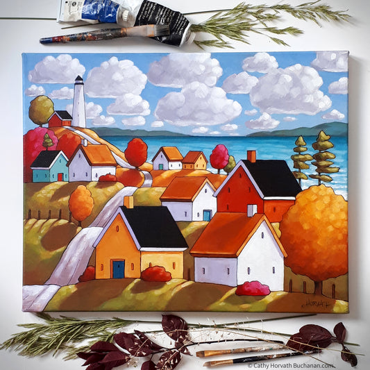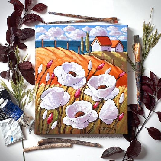 Coastal Cottages White Flowers Original Painting, Seascape 10x12