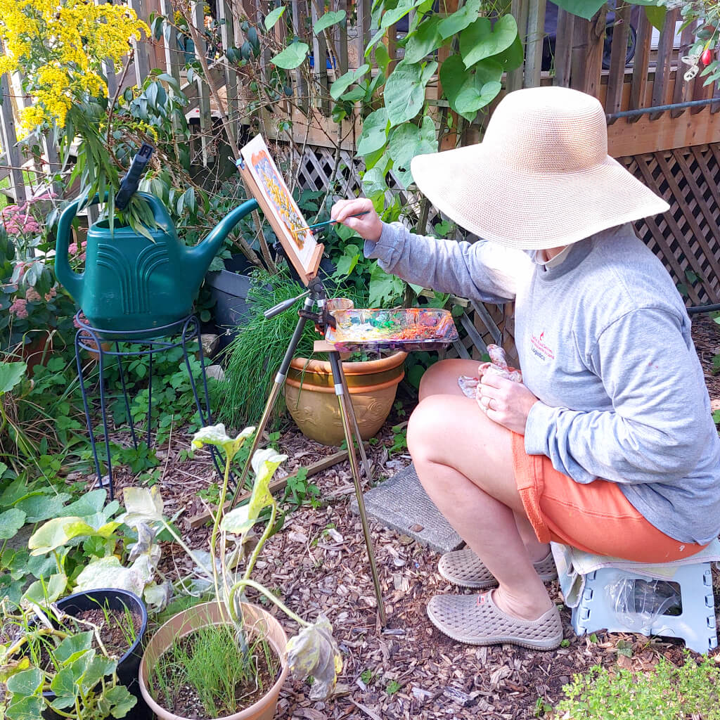 DAY 19/30 'Goldenrod', Goldenrod is currently flourishing everywhere I look as staple of autumn plant colors. We've also had some great fall clouds, so I combined both together ta-da. My hubby took a quick pick of me sitting in the garden painting (this is not a fashion statement lol ...holly-hobby garden grunge look), I sat low to get under the goldenrod for this interesting view.