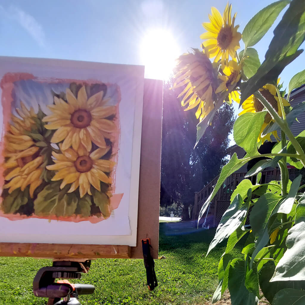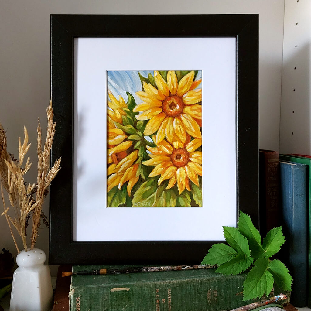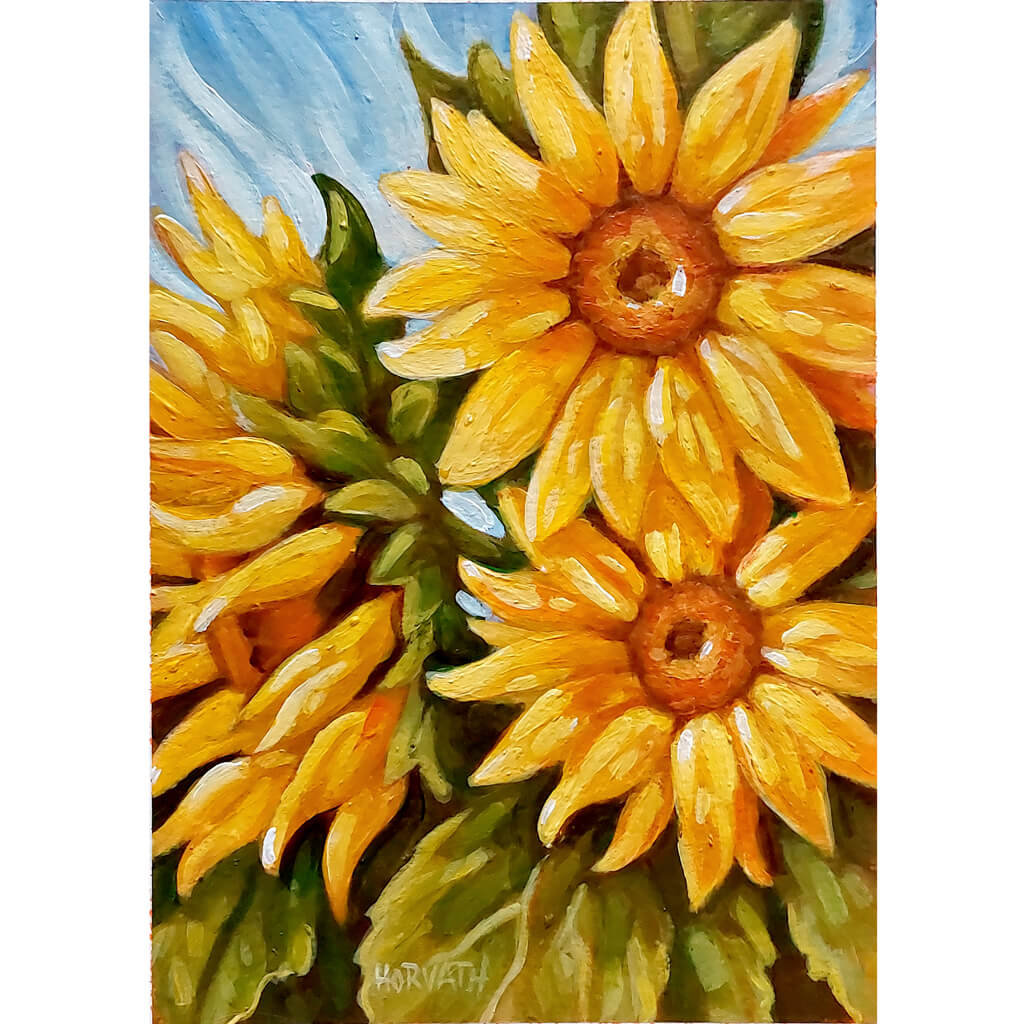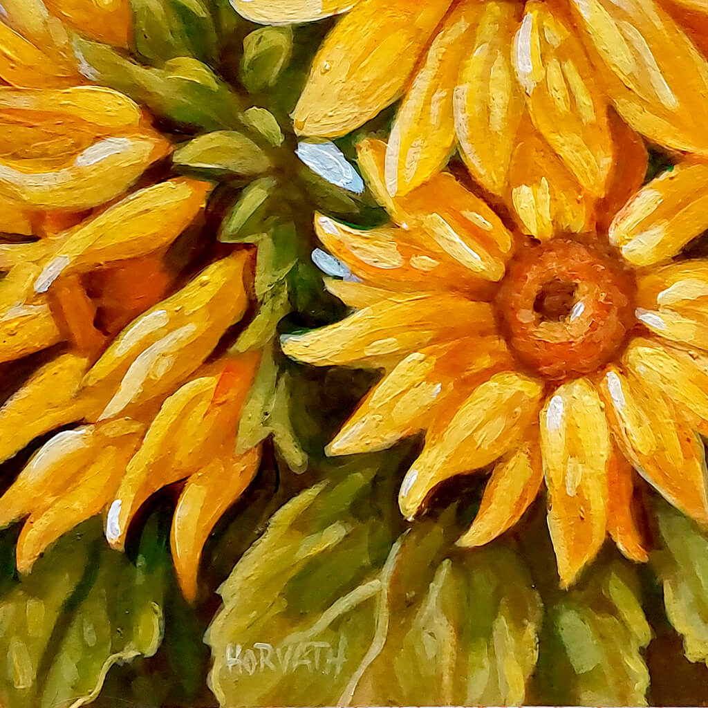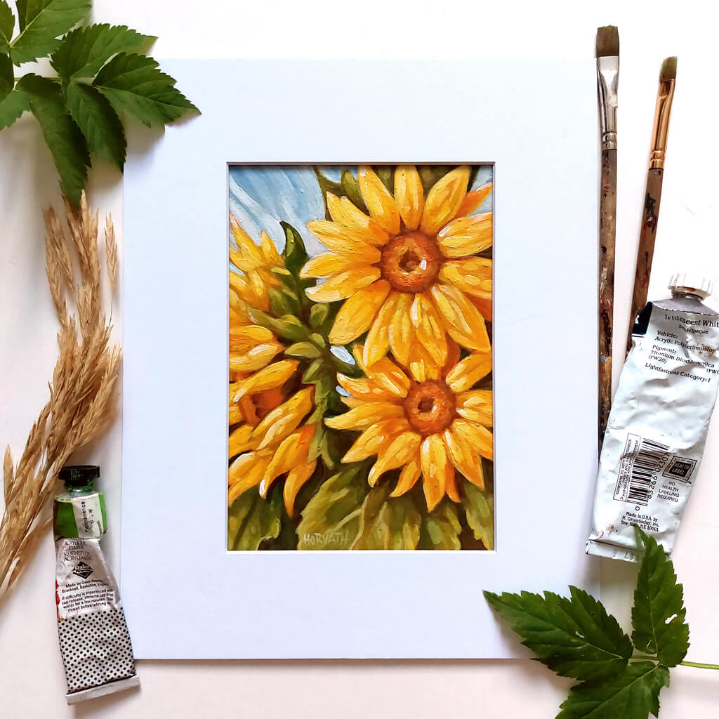 DAY 23/30 'Sunflowers', These grew in my neighbor's garden via stray sunflower seeds from his bird feeder, pretty good deal! While I painted, the bees were very busy checking these blooms out.