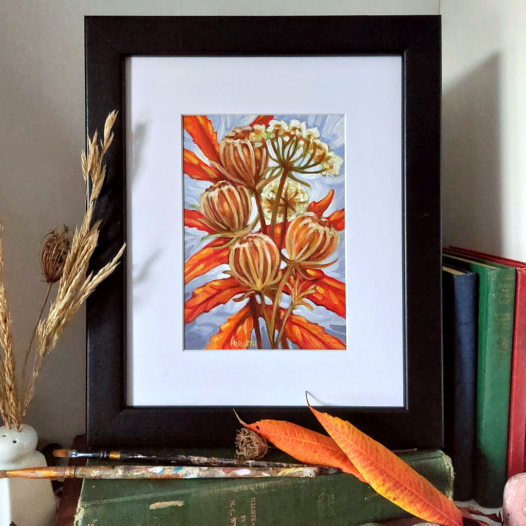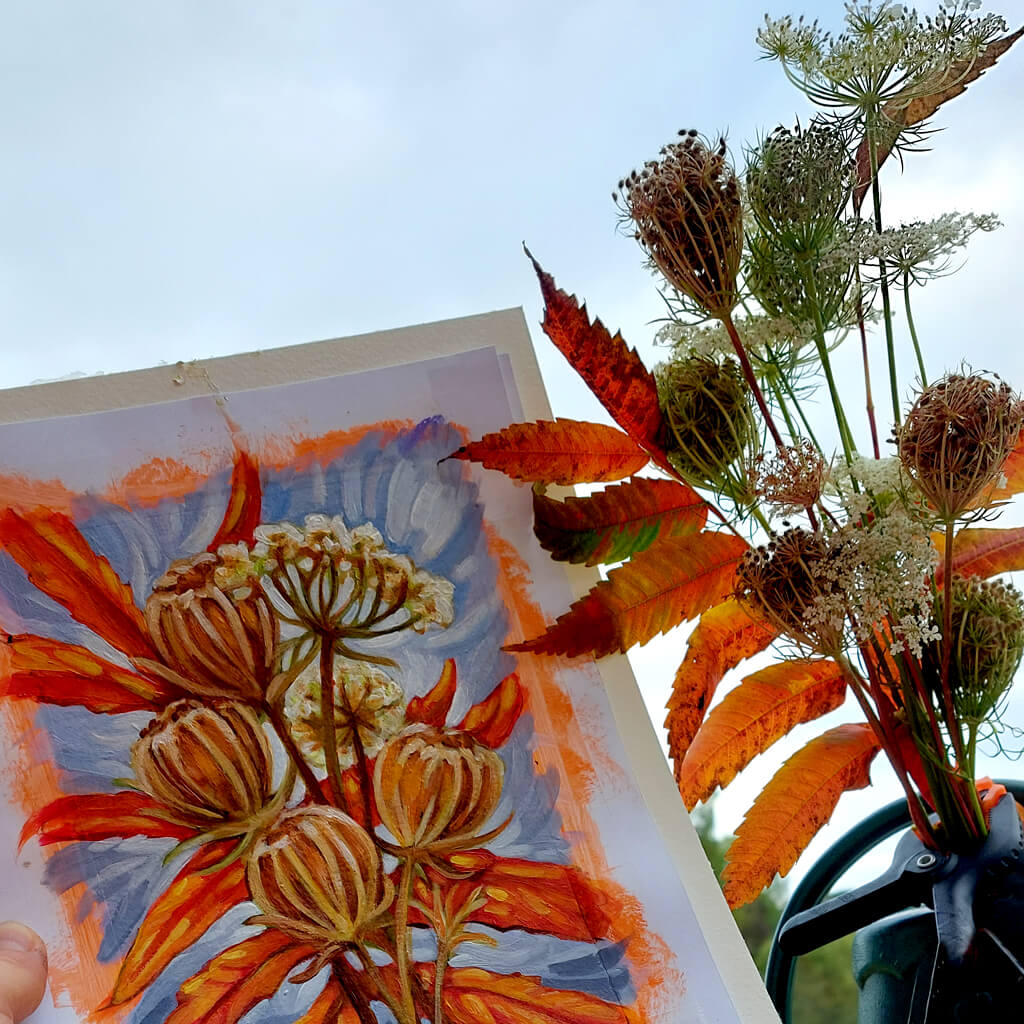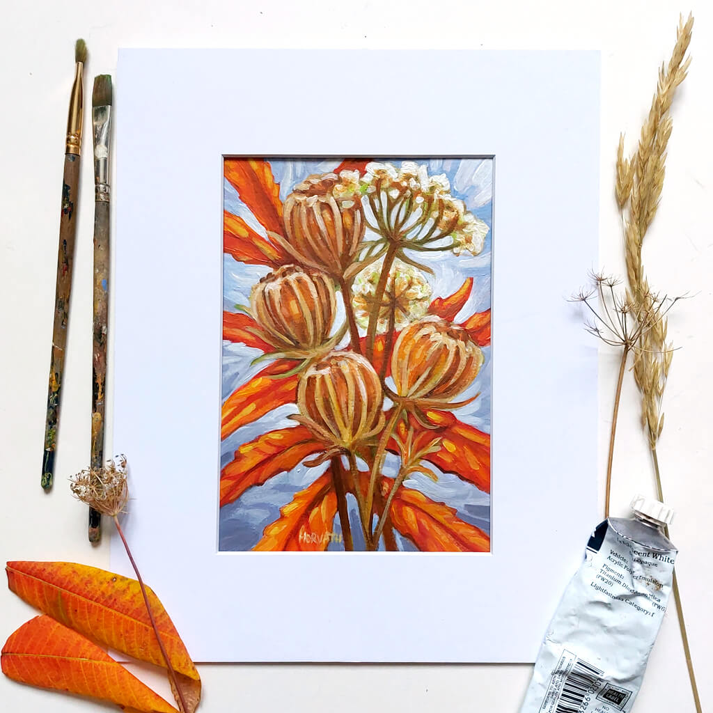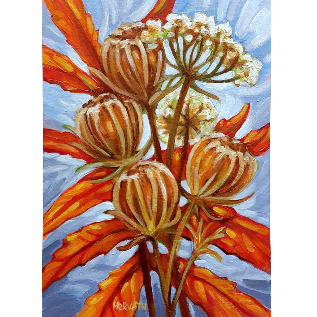 DAY 27/30 'Queen Anne's Lace', I paired this Queens Anne's Lace with sumac for some extra color and autumn vibe. I set it against a stormy fall sky to add some interest. Before painting this I didn't realize just how interesting the finished blooms are. I looked inside o couple of them and there was an insect living in each one, like little apartments on a stick.