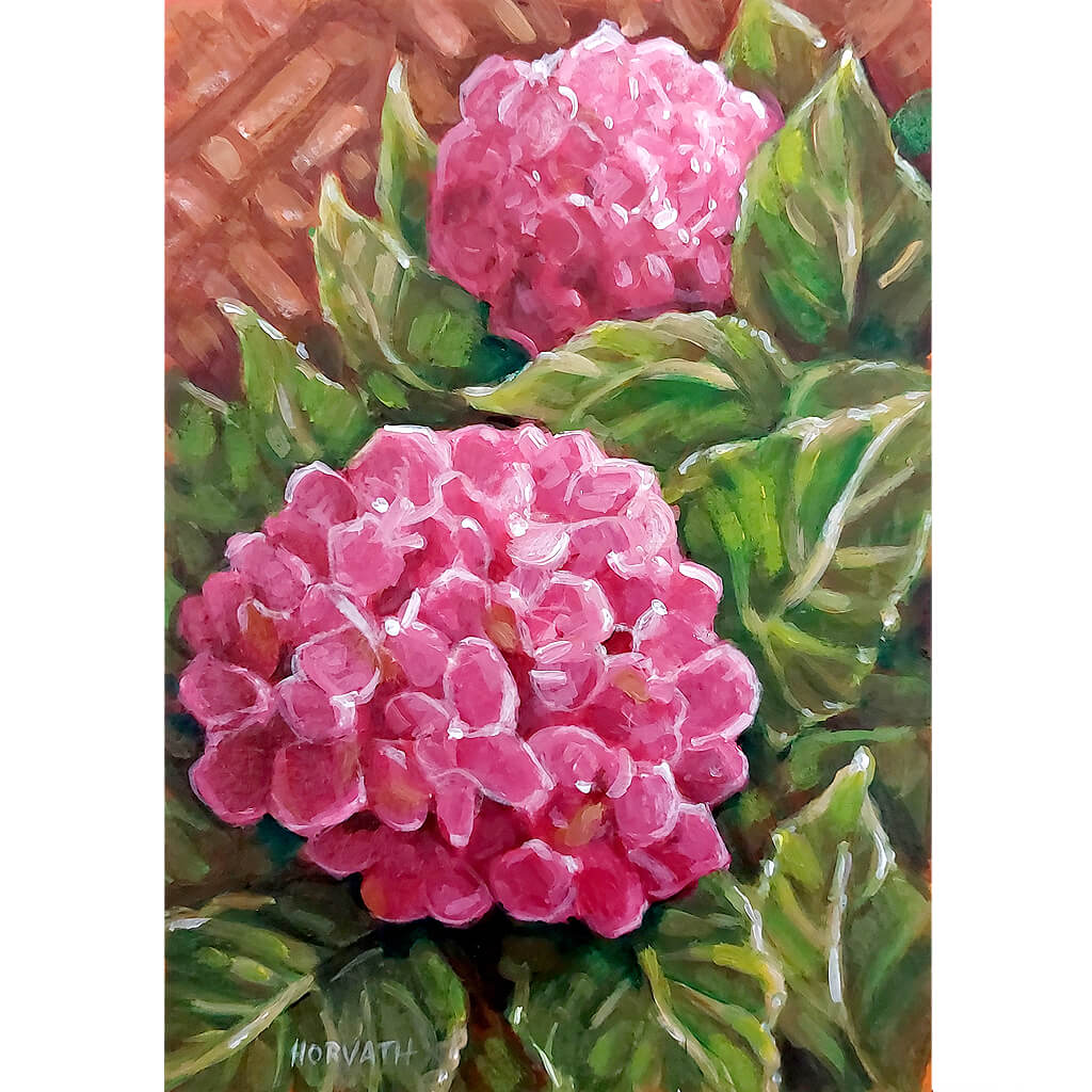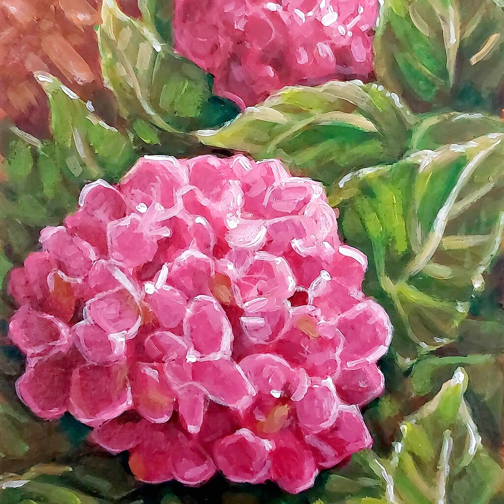 DAY 8/30 'Pink Hydrangea'- These Hydrangea belong to my lovely neighbor, an avid art fan who was delighted when she looked out to see me painting them lol. These are very interesting flowers... I just love the big globe shape made of small petals and their large green leaves that are thick and very beefy.